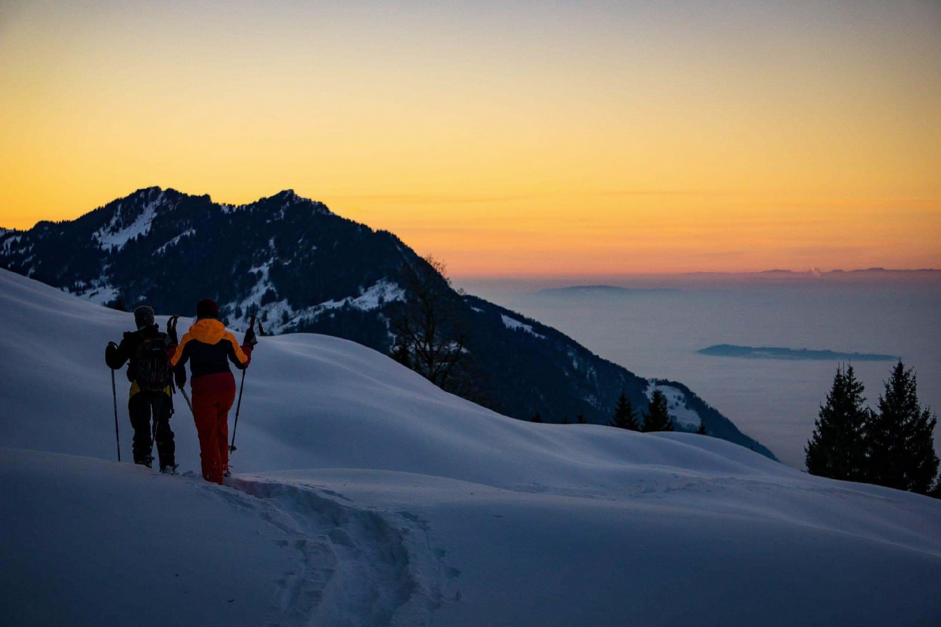 Der Treffpunkt ist die Talstation der Kerenzerbergbahn, wo wir Sie mit allem Notwendigen ausstatten: Schneeschuhe für sicheren Halt und bei Bedarf Stirnlampen, fällt die Wanderung in den Abend hinein. Je nach Schneelage starten wir direkt bei der Talstation oder genießen zunächst eine panoramareiche Bahnfahrt auf 1280 Meter über Meer.